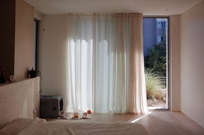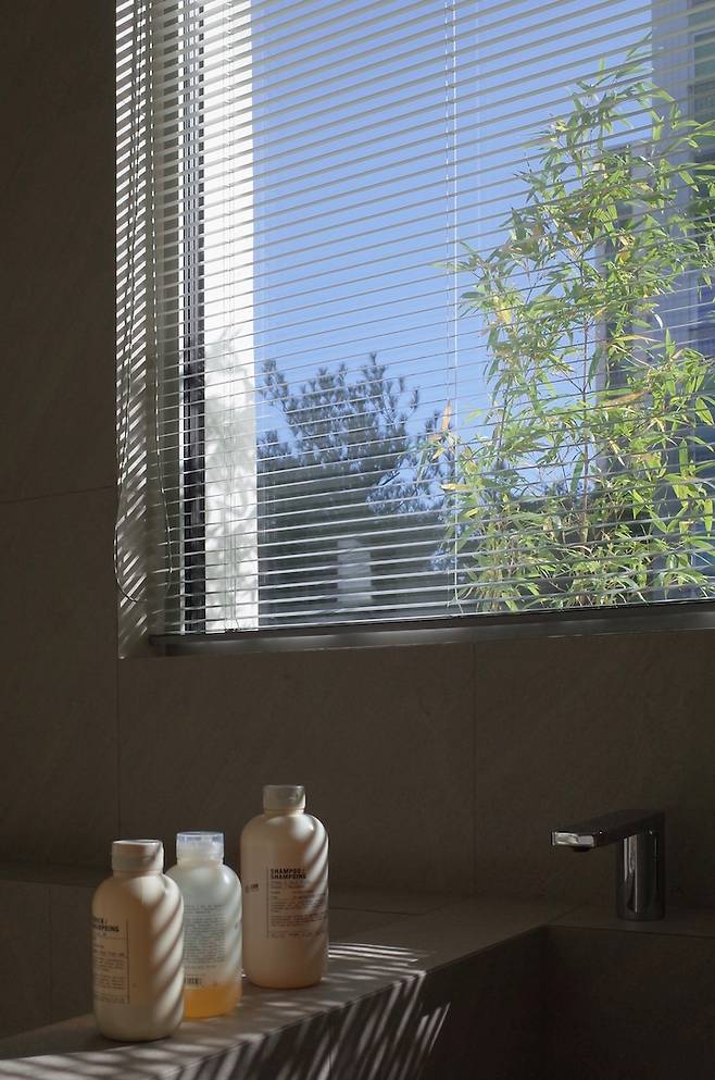 한 면에 크게 유리창을 내어 방의 일부처럼 끌어들입니다. 욕실과 침실 창으로도 녹음이 보일 수 있도록 정원에는 나무와 풀을 심었어요.