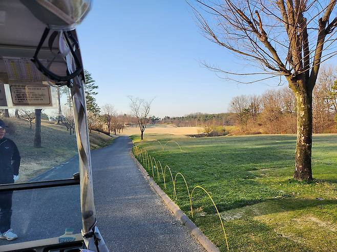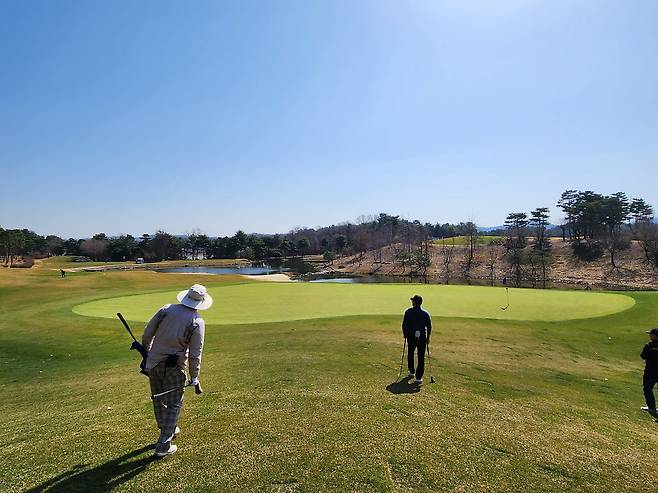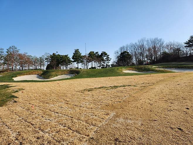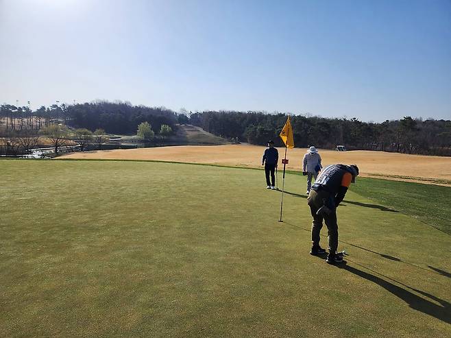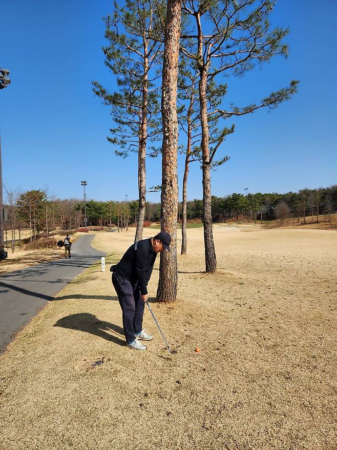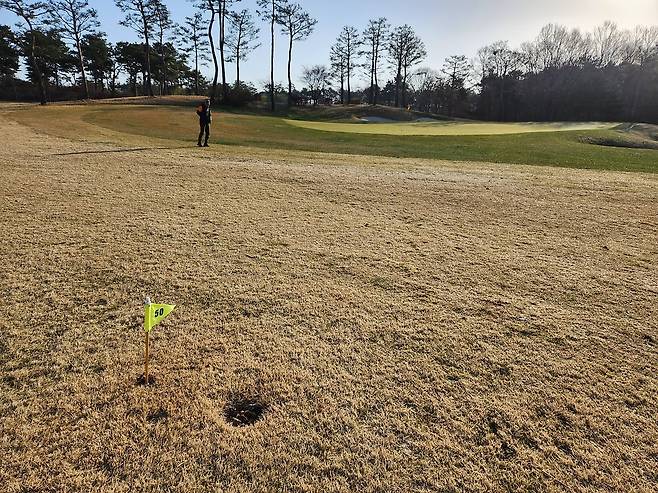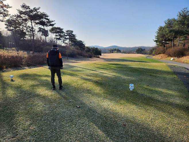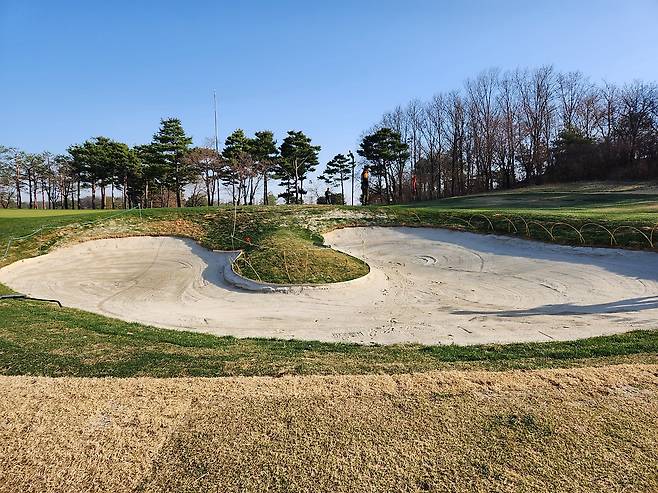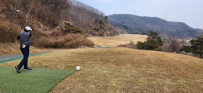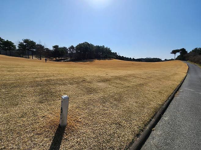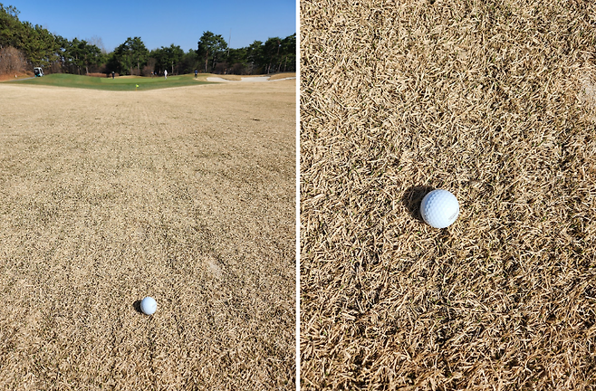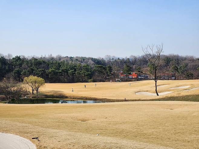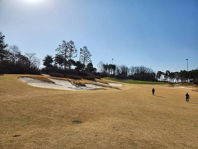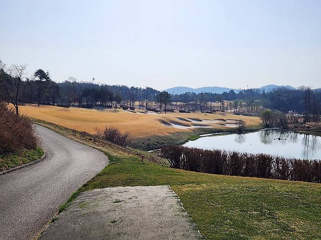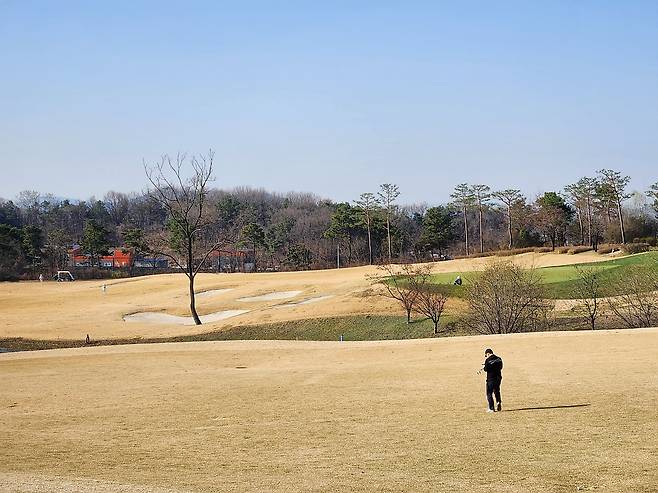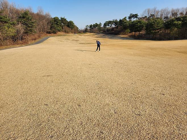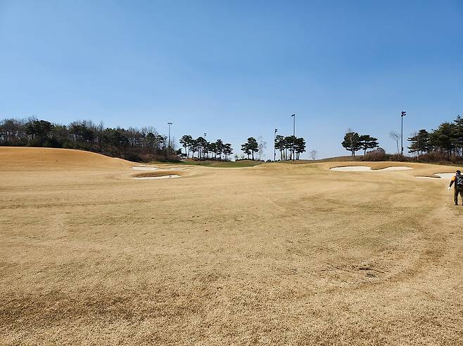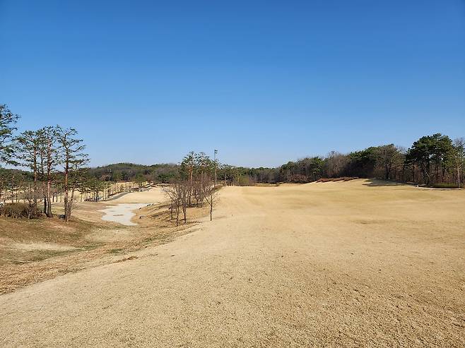 중지 페어웨이라서 아직 노란 잔디에 약간 건조했습니다. 올림푸스 코스는 크게 별다른 부분은 없었는데 마이디스 코스로 들어서니 페어웨이 표면에 결처럼 파인 흔적이 많았습니다. 따라서, 가끔 공이 흠 안으로 굴러들어가서 빼놓고 쳐야 할 때가 있습니다.