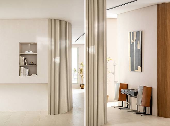 먼저 벽지로는 LX Z:IN 벽지 디아망 포티스. 표면 물성을 강화해 찢김이나 스크래치에 강한 디아망 포티스는 일상 속 스크래치뿐 아니라 반려동물의 발톱으로부터도 안전하다. 그렇다고 둔탁하지도 않다. 일반 벽지와 동일하게 시공해서 깔끔하게 마감할 수 있고, 심지어 곡선 형태의 공간에서도 칼각 마감 OK. 리얼 프린팅 기술을 활용해서 큰 규격의 유러피안 플라스터, 프렌치 워시 기법도 깔끔하게 구현하는데, 시공 후 이음매가 잘 보이지 않는 덕분에 마치 끊김 없는 한 장의 전폭으로 벽면을 시공한 느낌이라 만족감이 확 올라간다. 언제 망가질지 모르는 불안감에서 해방돼 슬림하고 깔끔한 미니멀 디자인을 유지하는 효도 아이템이다.