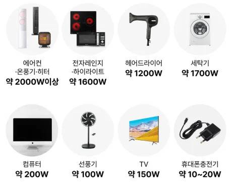 이런 제품들의 소비전력은 적게는 1000W부터 많게는 2000W가 넘어가기도 하는데, TV, 노트북, 선풍기 등의 일반 가전제품들 보통 50~200W 정도로 훨씬 전력소모가 적습니다.