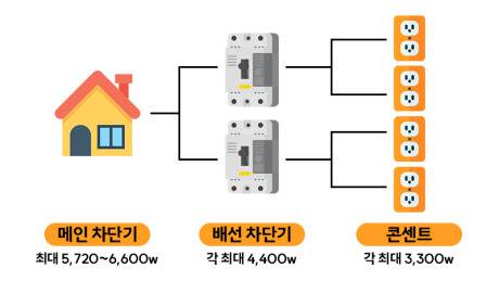소비전력이 높은 에어컨, 건조기, 인덕션 등을 동시에 사용한다면 전력사용량이 허용전력을 넘어갈 수도 있는데, 이런 경우 흔히 "두꺼비집이 내려갔다."라고 하며, 집의 메인 차단기가 작동하여 집안 전체의 전기가 차단됩니다.