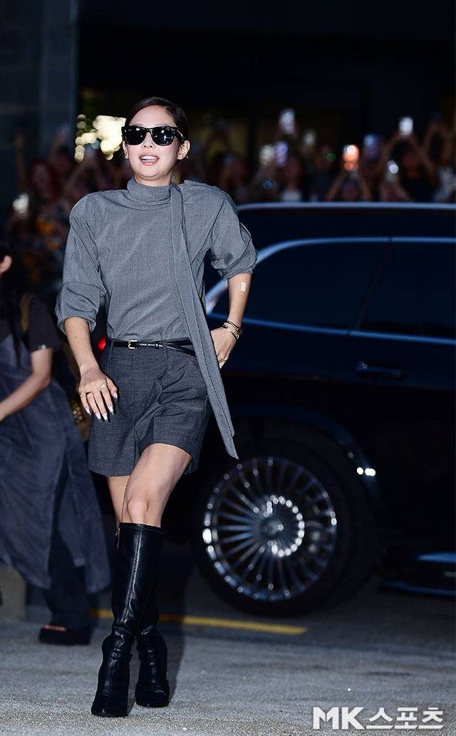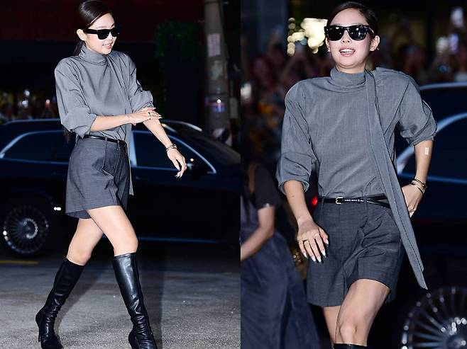 제니는 그레이 셔츠 톤온톤 셋업에 블랙 롱부츠를 매치하며 도시적인 무드를 완성했습니다.