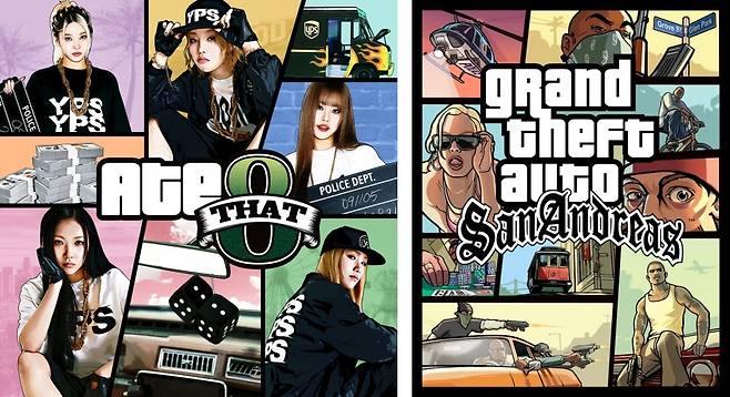 영파씨의 이번 뮤직비디오는 게임 GTA(Grand Theft Auto)를 오마주하며 큰 화제가 되었는데요. 앨범 커버에서도 폰트, 레이아웃, 보정 등 GTA의 그래픽을 오마주하며 콘셉트를 드러내고 있습니다. 특히 GTA 시리즈 중에서도 서부 배경인 ‘산 안드레아스’를 선택했는데요. 갱스터와 힙합 느낌이 특히 강한 시리즈로 이번 음악과도 정말 잘 어울리는 콘셉트인 것 같습니다!