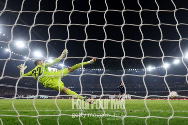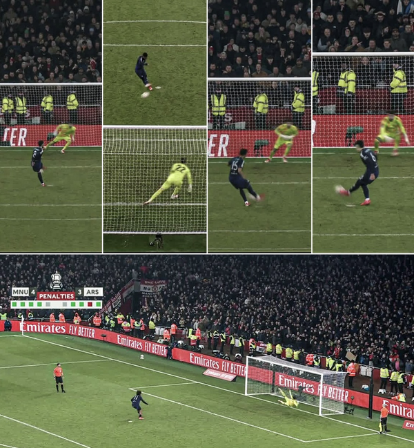 아스널 팬들은 승부차기 상황 라야의 모습을 보고 경악을 감추지 못했다. 바로 ‘예측 다이빙’을 했기 때문. 라야는 맨유 키커들이 공을 차기도 전에 먼저 다이빙을 시도했다. 공교롭게도 맨유 선수들은 모두 라야의 반대 방향으로 슈팅했다. 브루노 페르난데스, 아마드 디알로, 레니 요로, 리산드로 마르티네스, 요슈아 지르크지 모두 손쉽게 페널티킥을 성공시켰다.