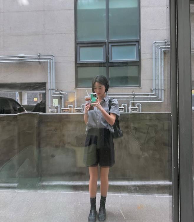 체크 셔츠와 블랙 쇼츠를 매치해 편안하면서도 감각적인 데일리룩을 선보였습니다.