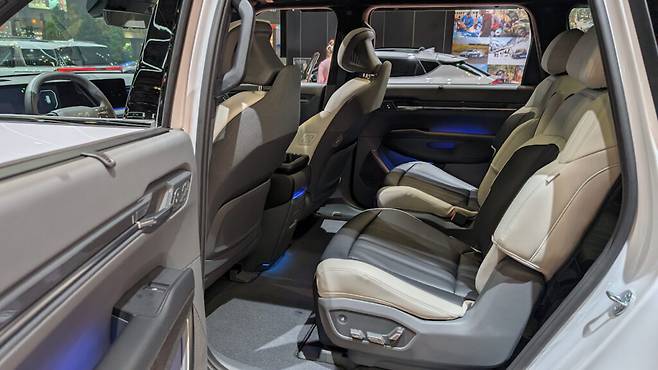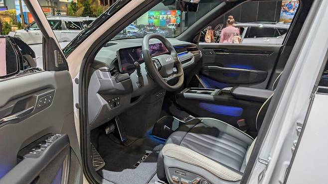 트림 선택에 따라 캡틴 체어 또는 2열 벤치 시트가 제공되는 6인승 또는 7인승 레이아웃이 계속 유지된다. 센터 콘솔은 현대 아이오닉 9와 달리 이중 레이어 수납 레이아웃을 제공하며, 컵 홀더, 무선 충전, 추가 수납공간이 실용성을 높였다.