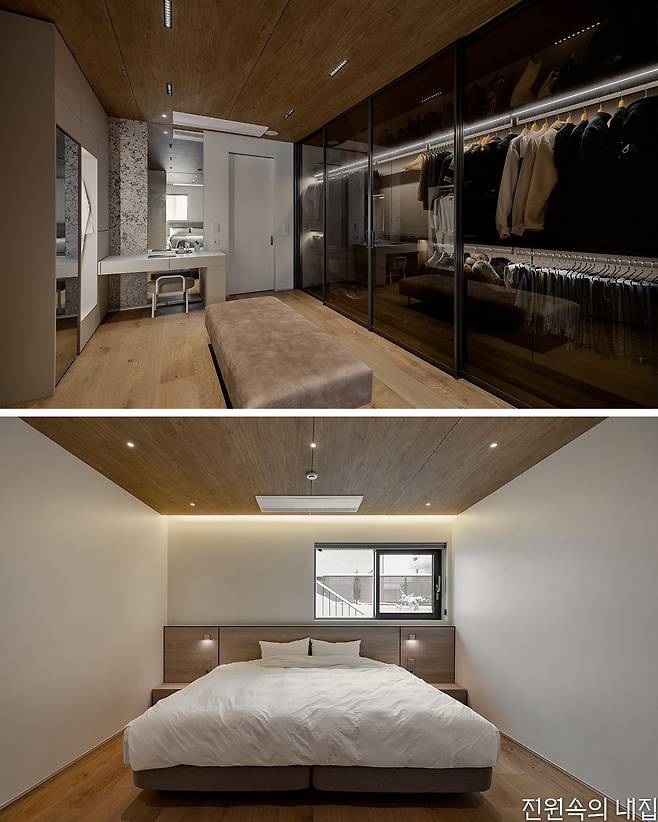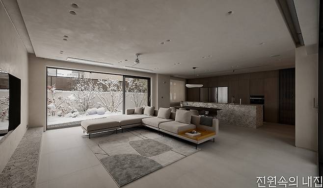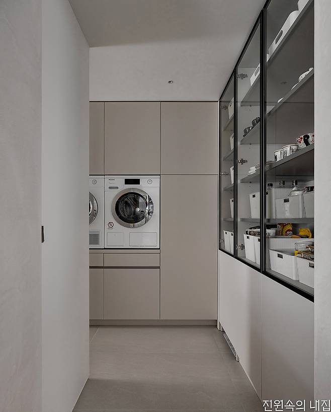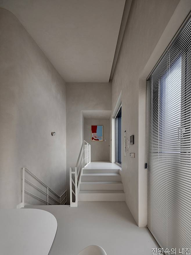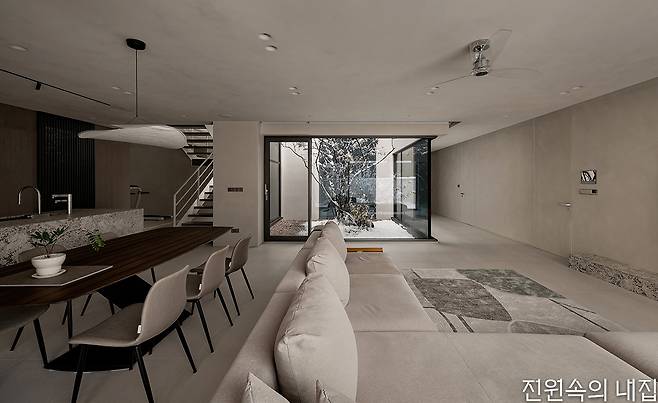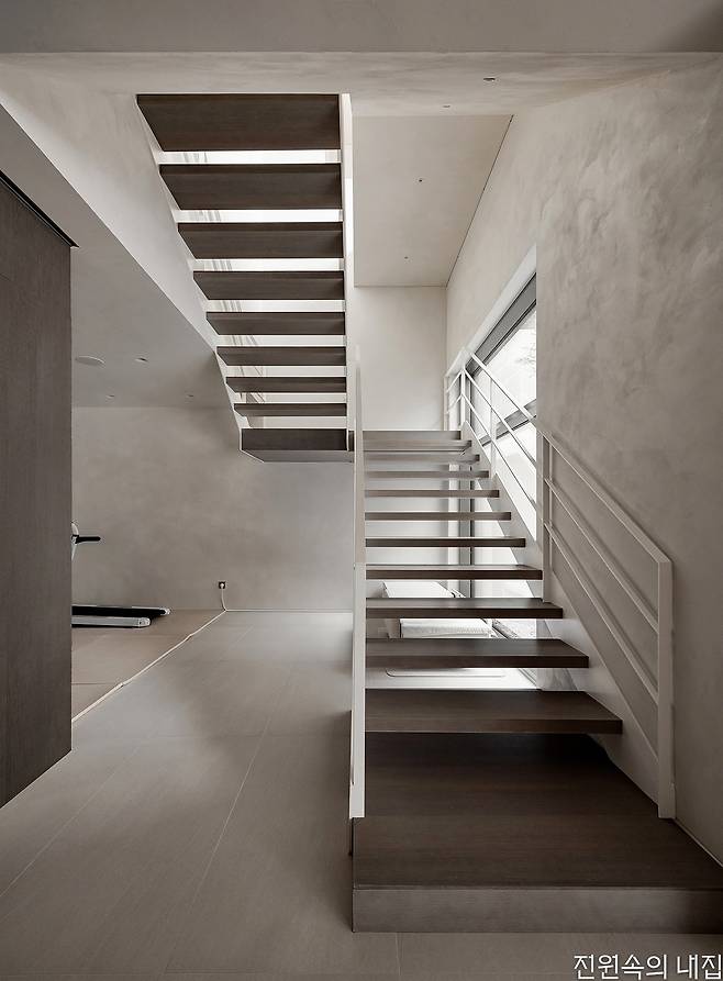 부부는 심플하고 미니멀한 인테리어 디자인을 통해 두 사람의 성향, 그리고 삶의 방식이 공간과 조화를 이룰 수 있길 바랐다. 이에 인테리어 설계를 진행한 ‘플립’은 디테일하고 감성적인 자재를 사용함으로써 화려함보다는 ‘절제된 세련미’를 표현하고자 했다고 설명했다. 특히 풍부한 질감이 느껴지는 자재들을 선택해 심플함 속 개성과 입체감이 느껴지는 공간을 그렸다.