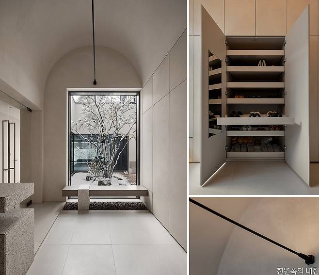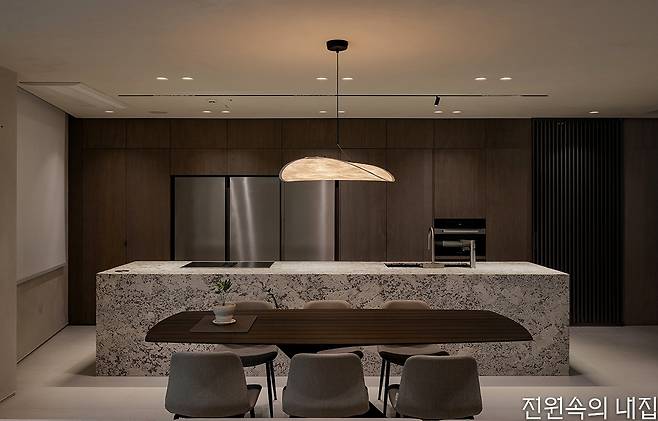 “저채도의 애쉬 그레이오크 무늬목, 회벽 질감의 유럽 미장 스페셜 페인트, 러프한 천연 대리석 등 자연의 텍스처가 살아있는 소재들을 매치해 시선이 머무는 곳마다 깊이와 균형이 느껴지도록 신중하게 설계했습니다.”