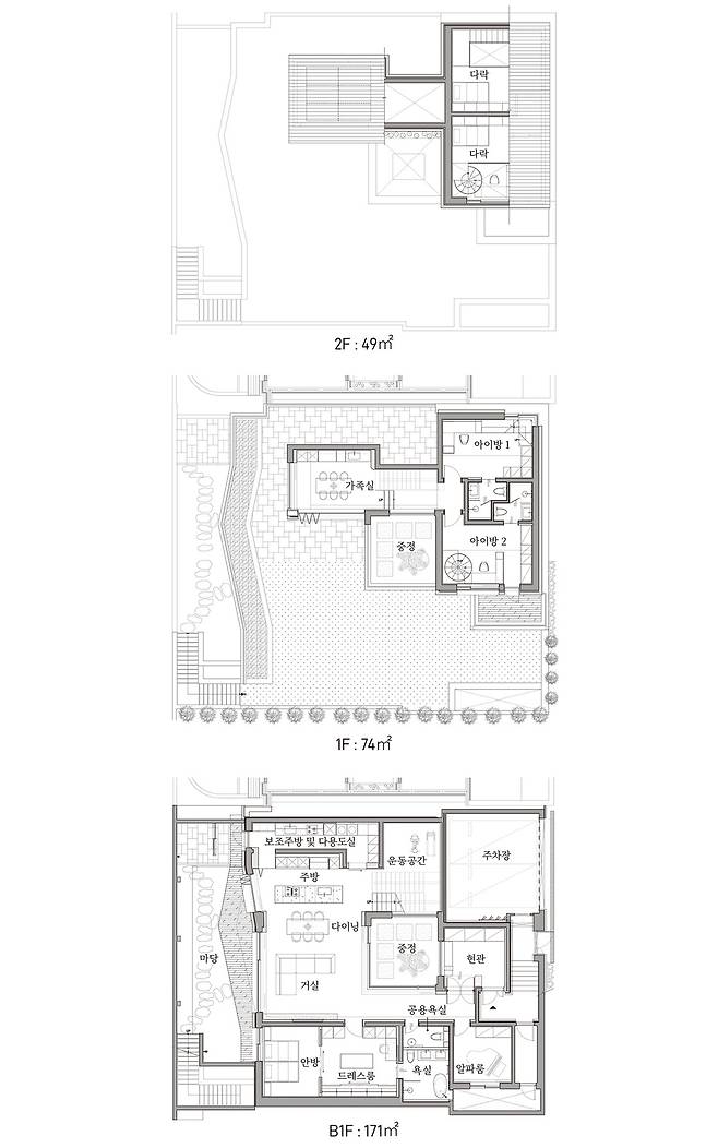 건축주 최준석, 한은미 씨 부부는 가족의 첫 집에 대한 계획을 세우면서 항상 단독주택 건축을 염두에 두고 있었다. 땅에 대한 로망과 함께 보금자리를 직접 구상하고 싶은 마음 때문이었다. 5년여간 파주부터 용인까지 사방으로 땅을 보러 다닌 끝에 용인 수지에 지금의 대지를 얻게 되었다. 집은 경사가 있는 대지의 특성에 따라 지하 1층과 지상 1층의 구조로 설계되었다. 거실, 주방 등 주요 생활 공간으로 구성된 지하 1층은 중정과 마당을 통해 채광을 들여 밝고 트인 시야를 갖는다. 지상 1층과 다락은 고등학생 아들과 초등학생 딸의 개성 있는 생활 공간으로 채워졌다.