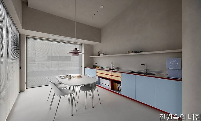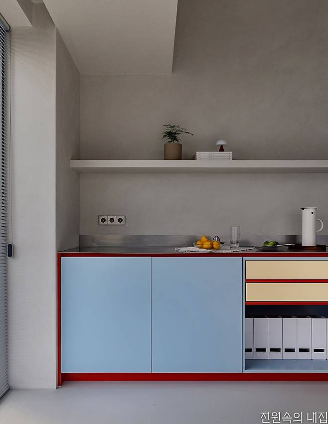 가족실과 아이들 방으로 구성된 1층은 지하와 달리 과감한 색감으로 분위기의 반전을 이룬다. 계단을 올라 바로 만나는 가족실은 간단한 세척과 음식 보관이 가능하면서 아이들의 학습 공간으로도 활용할 수 있는 형태를 고민했다. 스테인리스 상판과 유니크한 보색 컬러의 조합은 감각적이고 모던한 분위기를 만든다.