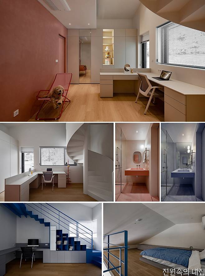 아이들 방은 동일한 면적의 미러형 구조로 이루어져 있지만, 내부 인테리어는 아이들의 성향과 취향에 맞게 꾸며졌다. 다락의 활용도를 높이기 위해 계단 설계에 심혈을 기울였고, 화장실에는 타일 대신 콘셉트에 맞는 컬러 마이크로시멘트를 사용했다. 고등학생 아들 방은 파란색 계단으로 메인 콘셉트를 잡고, 계단 하부를 책장으로 채웠다. 구조 보강을 위한 빔은 면으로 감싸 파우더 공간을 형성하고, 계단 아래 ㄱ자 책상과 하부장을 두어 수납과 실용성을 잡았다. 사랑스러운 코랄 핑크 컬러의 초등학생 딸 방은 공간의 중심에 나선형 계단을 설치했다. 책상과 파우더장은 창을 마주하도록 배치하고, 벽면을 따라 붙박이장을 제작해 공간을 알차게 구성했다.
