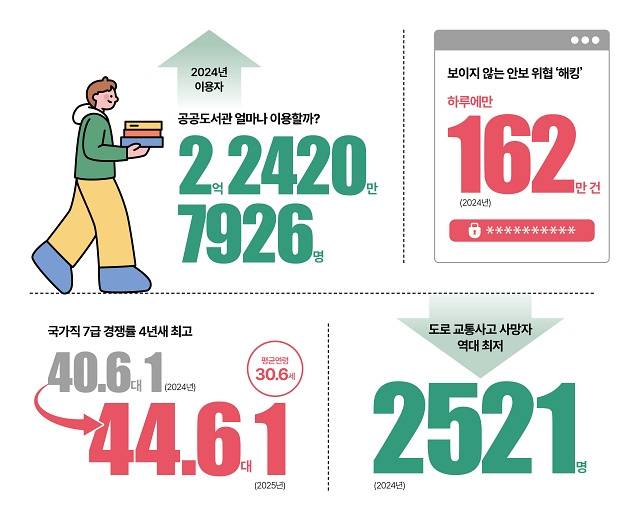 2024년 전국 공공도서관 이용자 수는 전년 대비 10.8% 증가한 2억 2420만 명을 기록했습니다. 우리나라를 위협하는 해킹 시도는 일평균 162만 건에 달하며, 도로 교통사고 사망자는 역대 최저치를 기록했습니다. 국가직 7급 공채 경쟁률은 최근 4년 사이 가장 높은 수준을 보였습니다. 자세한 내용은 정책주간지 'K-공감'을 확인하세요.