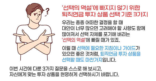 지금까지 3가지의 질문을 통해 퇴직연금(DC∙IRP) 가입자가 본인에게 맞는 투자 상품을 고를 때 점검해야 할 사항들을 알아봤는데요. 그 점검 과정을 한눈에 볼 수 있도록 아래의 그림으로 정리하였으니 잘 살펴보시기 바랍니다.