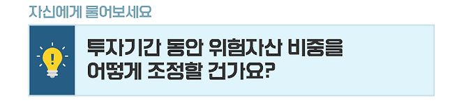 그리고, 위험자산 비중을 조정하는 주기와 방법도 살펴야 합니다. 투자기간 내내 일정하게 자산 비중을 유지할 것인지, 은퇴 시점에 맞춰 주식 등 위험자산 비중을 줄여 나갈 것인지도 정해야 합니다.