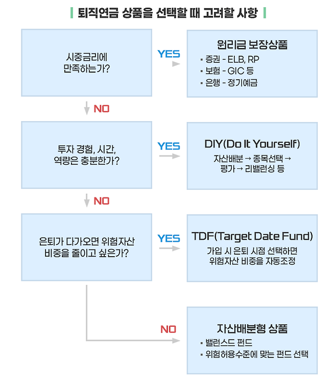 이해를 돕기 위해 복잡한 연금자산 투자 과정에서의 의사결정 프로세스를 아래의 그림으로 정리하였으니 확인해 보시기 바랍니다.