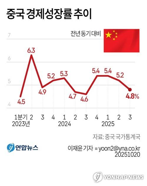 (서울=연합뉴스) 이재윤 기자 = 20일 중국 국가통계국에 따르면 중국의 3분기 국내총생산(GDP)은 전년 동기 대비 4.8% 올랐고 1∼3분기 성장률은 5.2%를 기록했다.