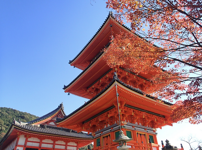 교토의 대표 사찰인 기요미즈데라는 절벽에 위치해 있어 주변 경관과 어우러진 단풍을 한눈에 내려다볼 수 있습니다. 기요미즈데라의 주요 건물인 ‘기요미즈 무대’에서 보는 단풍 경치가 특히 인상적입니다. 저녁 시간에는 단풍 조명을 밝히기도 해 더욱 아름다운 풍경을 감상할 수 있습니다.