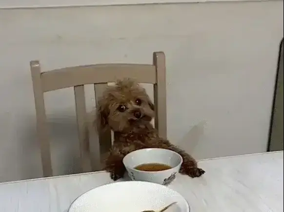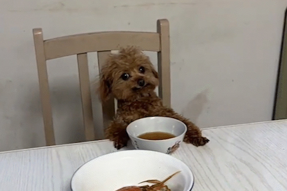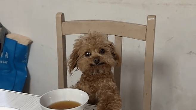 세상에, 강아지가 어느새 의자 위로 올라가 앞발을 테이블 가장자리에 얌전히 올려놓고 있었습니다. 마치 죄수를 심문하는 듯한 자세, 혹은 중요한 임무를 수행하는 듯한 모습이 눈길을 사로잡았습니다.