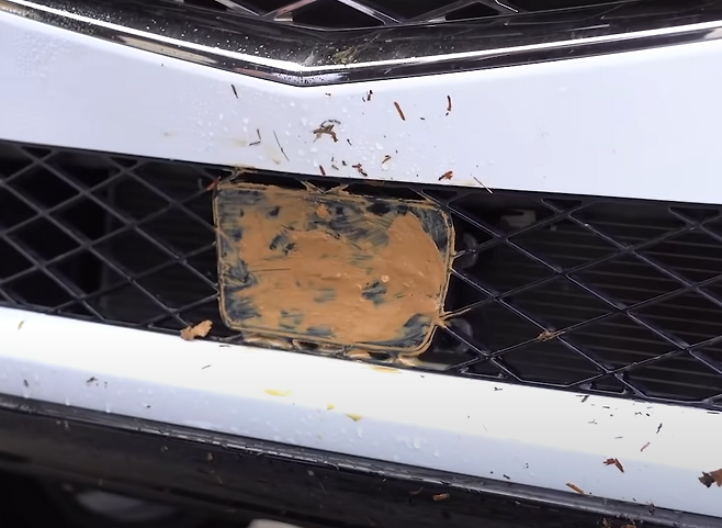 진흙길이나 흙탕 물길을 지나가게 되면 이처럼 하단에 있는 레이더 센서 커버에 진흙이 묻어 이대로 오염이 되어 가려지는 경우가 발생하는 상황을 재현해 보았습니다.