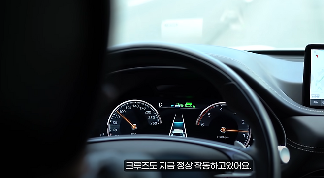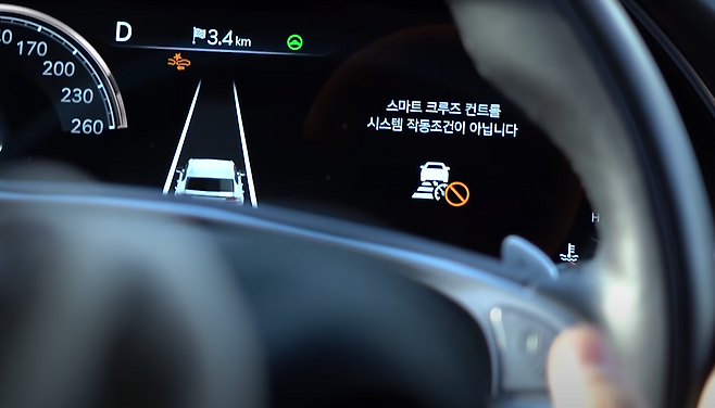 마지막으로 알아보았던 얼음의 경우에는 스마트 크루즈 컨트롤을 작동하기도 전에 "외부 환경으로 인해 레이더 감지가 제한되어 전방 안전 시스템이 중지됩니다."라는 알림과 함께 작동이 되지 않는 모습을 볼 수 있었습니다.