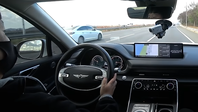 전방 레이더 센서 커버에 흙탕물이 묻어 있는 상황임에도 불구하고 차선유지 보조 기능과 스마트 크루즈 컨트롤 기능이 정상적으로 작동이 되는 모습을 볼 수 있었습니다.