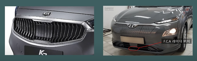 크루즈 컨트롤 옵션이 있는 차량 안에는 차선과 차량을 인식하는 카메라와 차 간의 간격을 인식하는 레이더 등 크게 두 종류의 센서가 장착이 되어 있습니다. 레이더 센서의 경우 차종마다 다르지만 전방 그릴 안쪽에 위치해 있습니다.