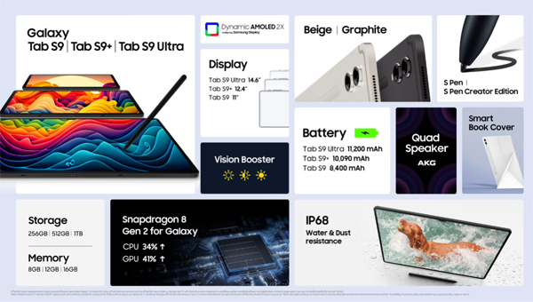 이번에 새롭게 선보이는 갤럭시 탭 S9 시리즈는 퀄컴 스냅드래곤 8 2세대 모바일 플랫폼과 Dynamic AMOLED 2X 디스플레이, 베이퍼 챔버 쿨링 솔루션, IP68 방수방진 등 프리미엄 기능을 적용한 태블릿으로 화면 크기에 따라 '갤럭시 탭 S9', '갤럭시 탭 S9+', 그리고 '갤럭시 탭 S9 울트라'로 출시된다.