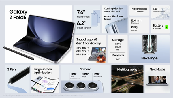 커버 디스플레이라는 눈에 보이는 큰 변화를 가져온 갤럭시 Z 플립5와 달리 갤럭시 Z 폴드5는 스펙상으로는 기대만큼 큰 변화를 없어 보인다.