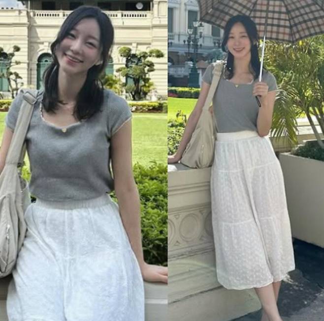 • 하의: 하의는 자연스럽게 퍼지는 A라인 화이트 롱스커트를 매치했어. 허리는 슬림하게 잡아주고 밑단으로 내려갈수록 가볍게 퍼지는 실루엣이 그녀의 여리여리한 체형을 더욱 돋보이게 해줬다는 사실! ✨