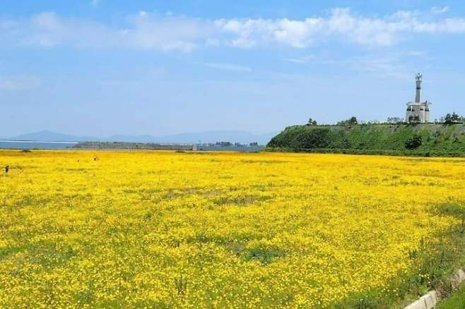 신시도 전망대로 목적지를 설정하고 가면, 왼편으로 넓게 펼쳐진 금계국 들판을 감상할 수 있다. 푸른 바다와 파란 하늘이 어우러진 이곳은, 금계국이 더해지면 그야말로 동화 같은 풍경을 만들어낸다.
