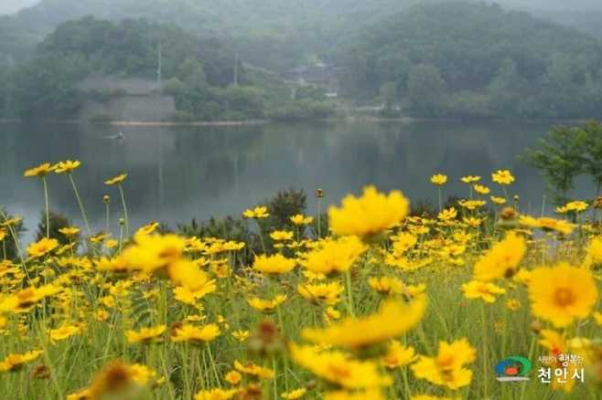 충남 천안시 서북구 천흥저수지 인근에는 매년 5월 말부터 금계국이 활짝 피어 황금빛 물결을 이룬다.