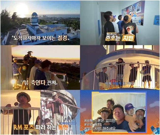 이날 ‘독박즈’는 사이판의 일몰 명소이자, 바비큐 맛집으로 유명한 한 레스토랑을 찾아간다. 등대를 리모델링한 하얀 외관의 식당에 도착한 멤버들은 “여기가 BTS가 화보를 찍었던 곳이네, 가보자!”며 설렘을 드러낸다. 잠시 후 이들은 식당 내부에 걸려 있는 BTS 화보를 감상하고, 각자 한명씩을 콕 짚어서 ‘독TS’를 결성한다. 특히 김준호는 “난 뷔 할래, 뷔~”라며 흥분하는데, 홍인규는 “준호 형은 ‘지민’이를 해야지!”라고 조언해 김준호를 급 수긍하게 만든다. 이에 김준호는 “지민이 어딨어?”라며, 화보 속 지민을 애타게 찾아 웃음을 안긴다.