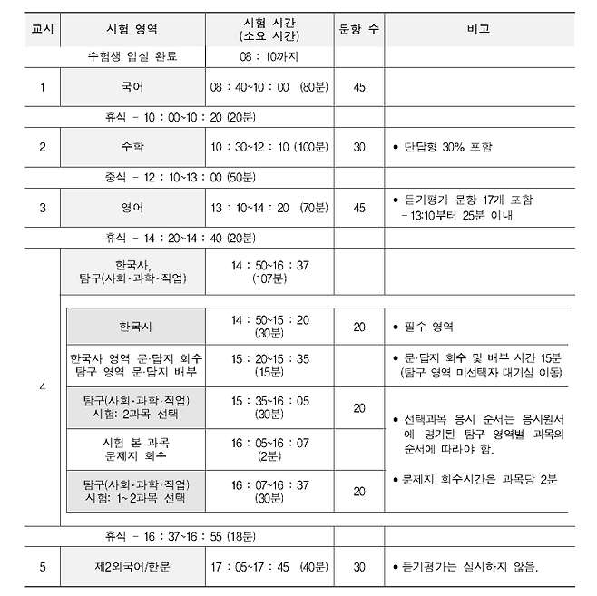 - 탐구 과목 선택 수에 따라 종료 시간이 달라짐 (최대 17시 45분 종료)
