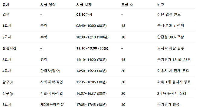 입실 시간, 점심시간, 듣기평가, 탐구 순서까지 모두 몸에 익혀두면 당일 ‘실수 없는 하루’를 만들 수 있습니다.
