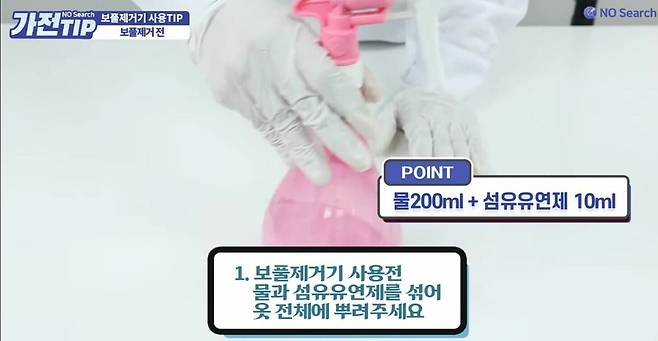 보풀제거기를 사용할 때, 생각보다 먼지가 많이 날 수 있습니다. 그런데 이렇게 먼저 옷에 물과 섬유유연제를 섞어 뿌리게 되면, 정전기를 방지하고 먼지 날림 또한 줄여줄 수 있습니다.