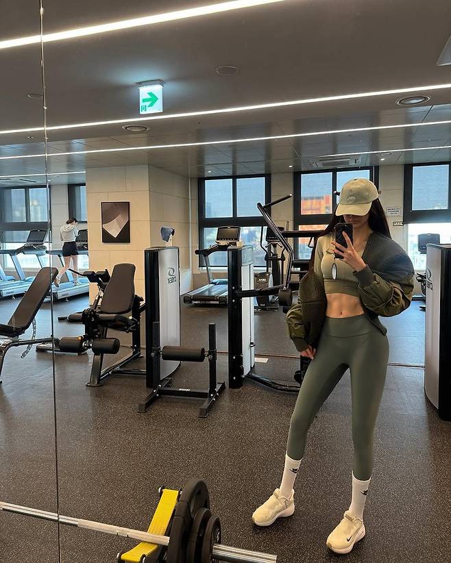 사진 속 그녀는 카키 톤의 브라탑과 레깅스를 세트로 매치한 후, 크롭 점퍼를 가볍게 걸쳐 룩에 입체감을 더했다. 상의는 바디 실루엣을 강조하는 피트한 스타일로, 그녀의 운동으로 다져진 복근 라인을 고스란히 드러내며 시크한 매력을 발산했다. 무심한 듯 걸친 점퍼는 캐주얼하면서도 쿨한 무드를 연출하며, 전체적인 밸런스를 잡아주는 키 아이템으로 작용했다.