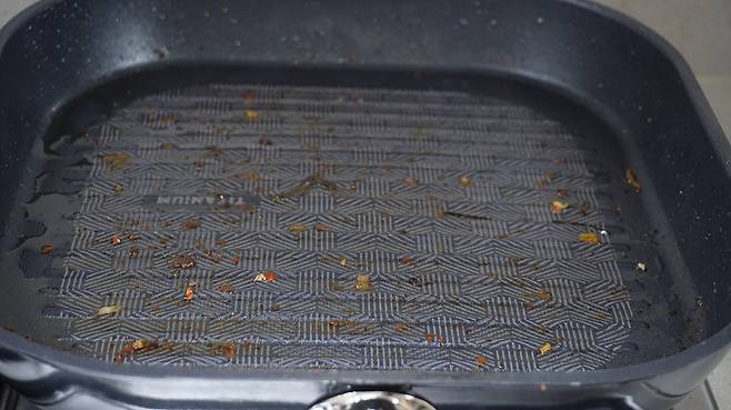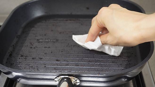 그다음 커피를 뿌려서 키친타올로 함께 닦으세요. 이렇게 하면 잔여 기름기도 제거되면서 후라이팬에 뱄던 비린내 등도 같이 없앨 수 있습니다.