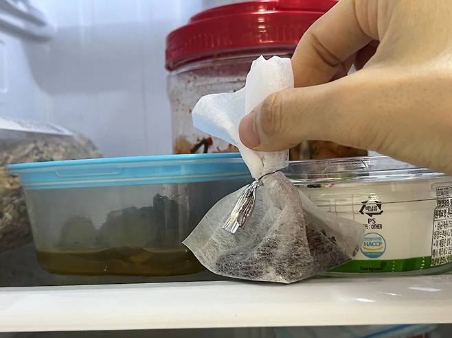 이렇게 만든 커피 탈취제를 냉장고 선반에 두세요. 여러 개를 만들어서 각 칸마다 두면 탈취 효과가 더 좋습니다.
