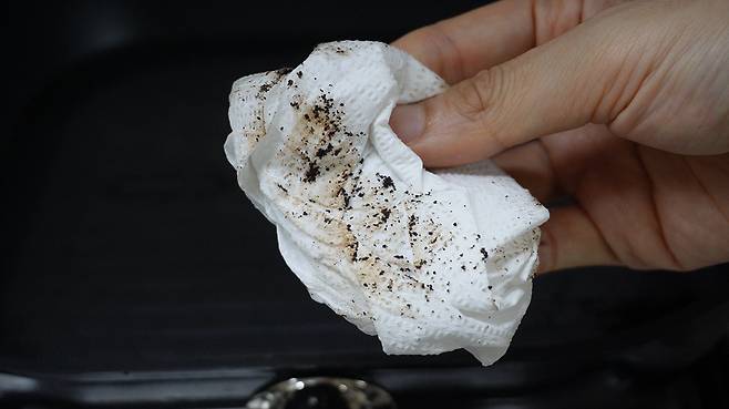 고기나 생선 등을 먹고 난 후 기름기가 많이 남은 팬을 닦을 때도 커피가 유용합니다. 1차로 키친타올을 활용해 기름기를 한 번 정리합니다.