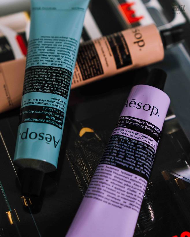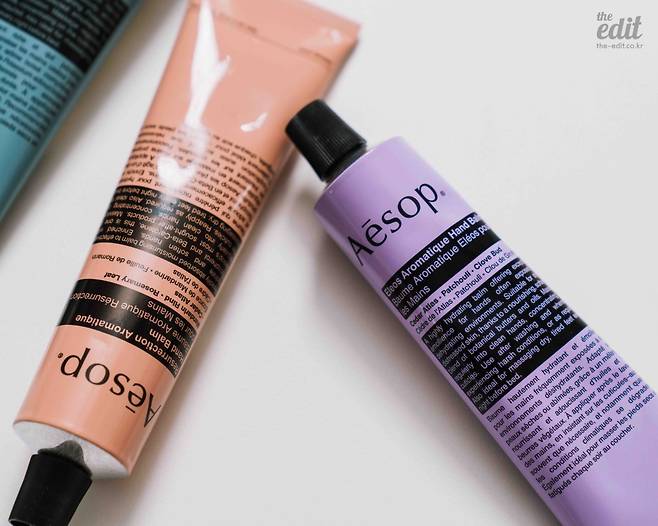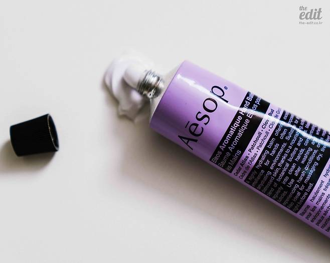 그렇다면 몇십 년 만에 나온 핸드크림의 향은 어떨까요? 저의 첫 느낌은 전형적인 ‘이솝 매장향’이라는 겁니다(좋아하시는 분들 많죠?) 클로브와 패출리 덕분에 조금 더 우디하고 이국적인 느낌을 내는데요. 패키지 색깔 때문인지, 라벤더 향도 은은하게 느껴져서 마음이 차분해지더라고요. 한 문장으로 콕 집어 말하자면, 이솝의 마라케시 인텐스 같은 느낌의 향이랄까요?