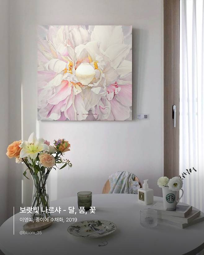 달항아리를 품은 이영미 작가의 <보랏빛 나르샤> 생화 원화를 보세요. 향수를 뿌리지 않아도 화이트 머스크향이 공간을 감도는 것 같습니다. 탁자 위에 예쁘게 놓아진 꽃들과 잘 어울리는 데요. 가벼운 브런치와 함께 커피 한 잔을 마시며 은은하게 퍼지는 생화의 향을 그림으로 감상해 보세요. 그리고 자그마한 소원을 생화 중심에 있는 달항아리에 소복소복 담아보세요.