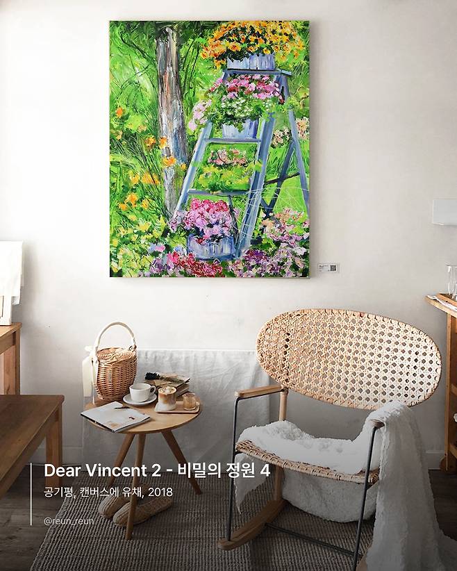 우드톤 인테리어에 잘 어울리는 공기평 작가의 <Dear Vincent> 작품입니다. 작은 나무 원탁에 라떼 한 잔 올려놓고 란탄 의자에 앉아 정원을 바라보는 기분을 원화로 느껴보세요. 마치 가드닝을 한 바깥의 모습이 한 벽면을 메운 것 같습니다.