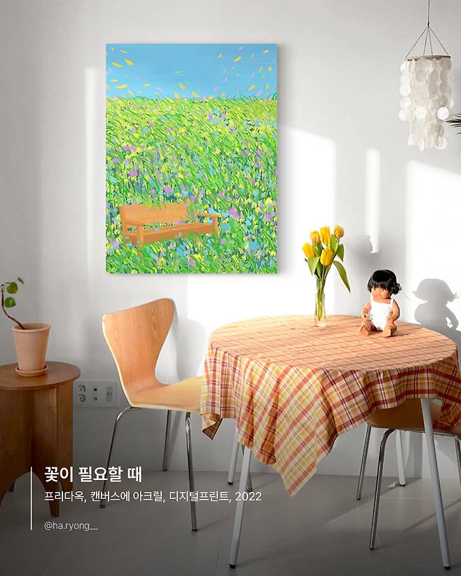 전체적으로 파스텔톤과 우드톤을 조합한 홈카페 인테리어입니다. 원형 탁자의 체크무늬 식탁보가 포인트인데요. 프리다옥 작가의 <꽃이 필요할 때> 작품은 알록달록 여러 파스텔 색감을 담은 공간과 너무나 잘 어울립니다. 오히려 원화 작품으로 공간 전체가 파스텔톤으로 꾸민듯한 모습으로 느껴지게 해 줍니다. 블라썸, 봄이 떠오르는 홈카페를 꾸미고 싶으시다면, 프리다옥 작가의 작품을 걸어보세요.