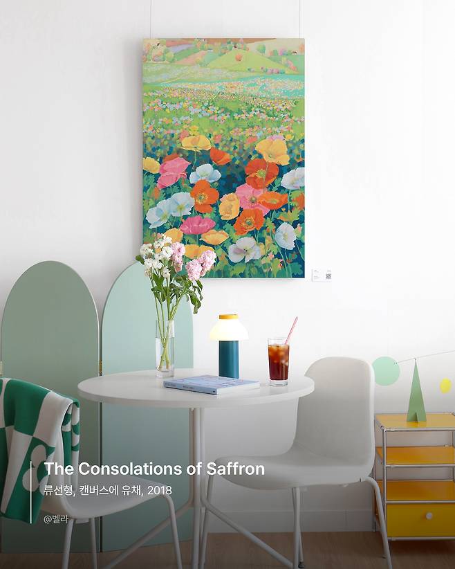류선형 작가의 드넓은 풍경을 보니 답답했던 마음도 뻥 뚫리는 기분입니다. 간단한 샌드위치와 함께 시원한 아이스 아메리카노를 마시며 잠시 원화를 감상해 보세요. 살림살이 가득한 집에 나만의 힐링 공간이 한편에 있다면 더없이 행복할 겁니다. 당신을 위한 선물로 류선형 작가의 <The Consolations of Saffron>을 걸어보세요.