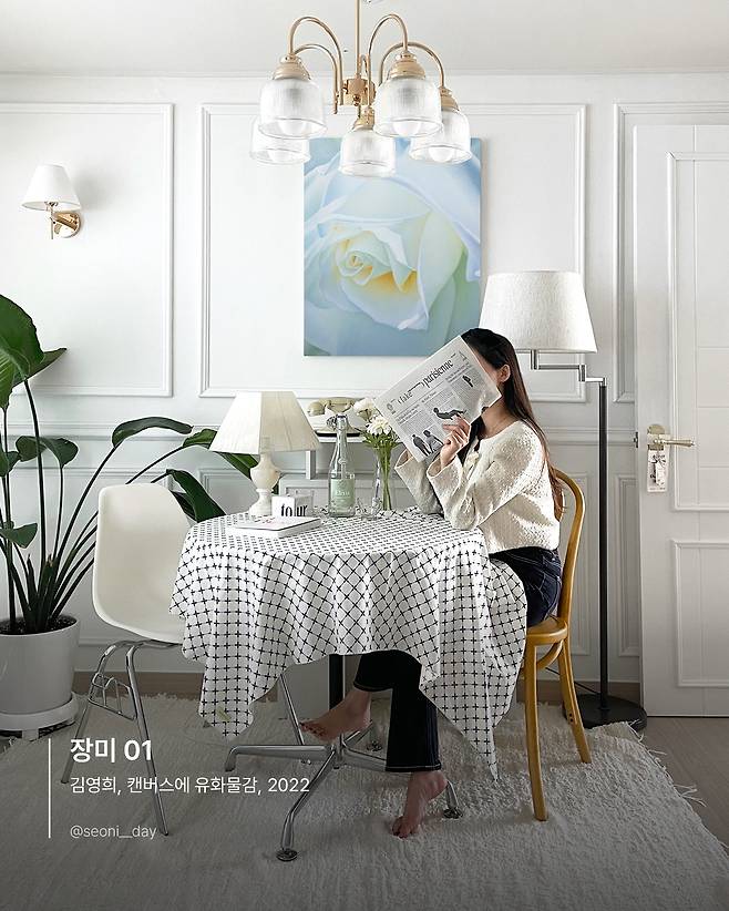 김영희 작가의 <장미> 작품으로 프랑스의 한 카페에 온 듯한 기분을 집에서 느껴보세요. 전체적으로 화이트 톤으로 꾸민 공간이 깔끔하게 보이는데요. 자칫 허전하고 밋밋할 수 있는 벽에 장미 원화 그림이 홈카페 분위기를 완성해 줍니다. 특히 몰딩 인테리와 어울리는 원화이므로 화이트와 프렌치 스타일이 조합된 나만의 홈카페를 만들고 싶다면 <장미> 원화를 걸어보세요.