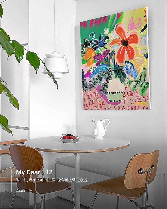 김태린 작가의 <My Dear> 작품은 뚜렷한 원색이 돋보이는데요. 심심할 수 있는 화이트 인테리어를 살려주는 원화입니다. 화이트의 차분함과 어우러지며 재치 있고 발랄한 분위기를 내주는데요. 이러한 분위기가 친구분들, 가조분들, 사랑하는 사람들과 즐거운 대화를 나누며 가벼운 차 한 잔을 하기에 좋은 공간으로 만들어 줍니다. 해당 작품을 걸어보시고, 심심한 공간에 생기를 불어넣어 주세요.