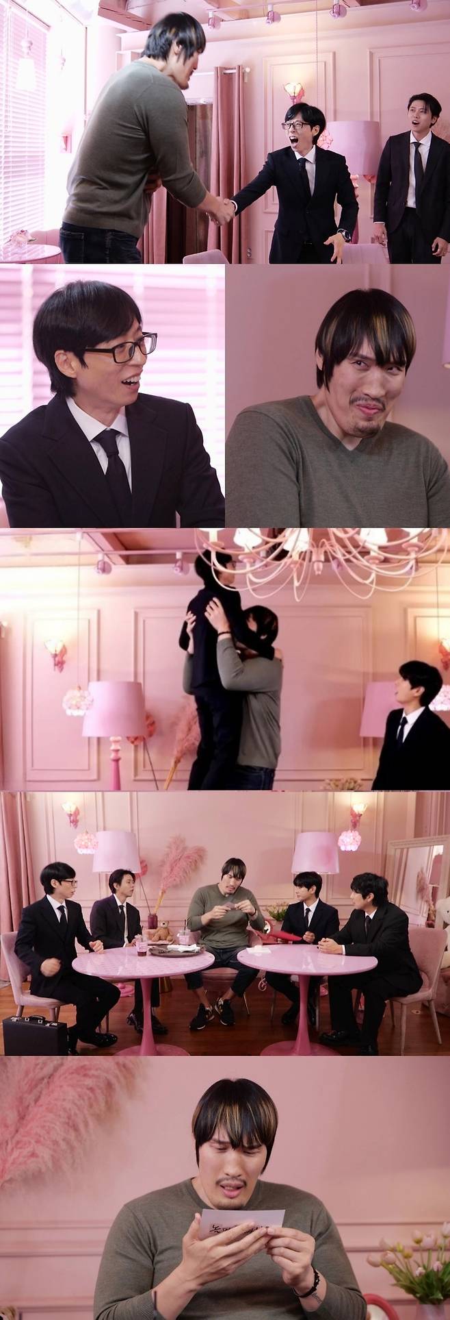 공개된 사진 속에는 핑크색 아이템으로 꾸며진 귀여운 공간에 압도적인 피지컬의 최홍만이 등장한다. 거대한 체구 덕분에 유재석, 하하, 주우재, 이이경이 ‘미니 사이즈’로 변한 듯한 대비가 시선을 끈다. 특히 유재석이 최홍만에게 번쩍 안겨 대롱대롱 매달린 장면은 폭소를 유발한다.