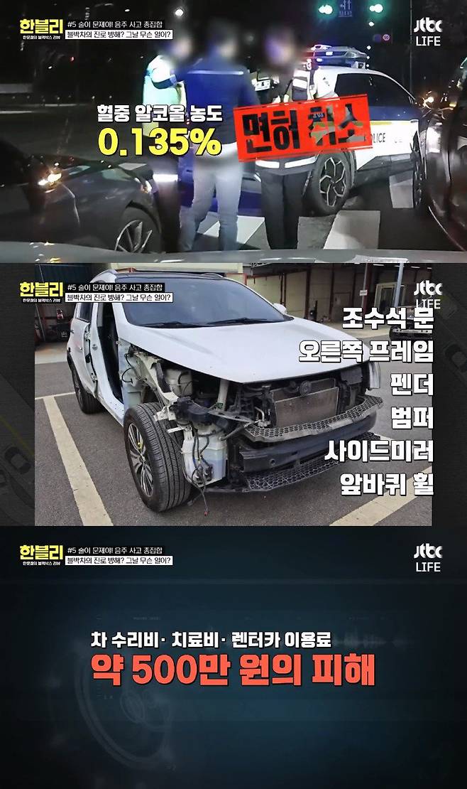 혈중 알콜농도 0.135% 음주운전 검거에 기여했으나 500만원 가량의 손해를 입음.
