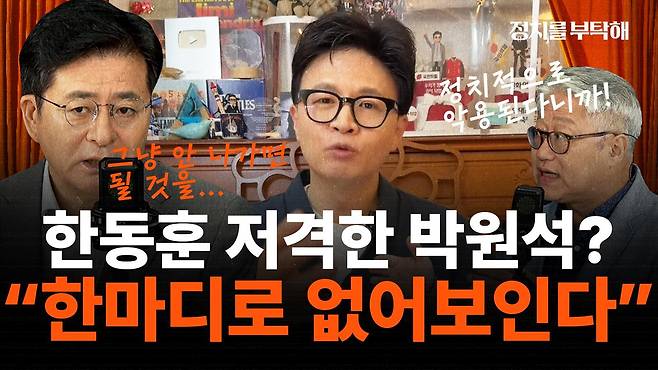 박 전 의원은 “(한 전 대표가) 우원식 국회의장이 당시에 민주당 이재명 대표를 기다리려고 의사진행 절차를 지연시켰던 거 아니냐는 얘기까지 했다”며 “그것을 역공이랍시고 공격하는 것은 제가 보기에 좀 한마디로 없어 보인다. 그 얘기는 그만하셨으면 좋겠고 그냥 안 나가면 된다”고 했다.