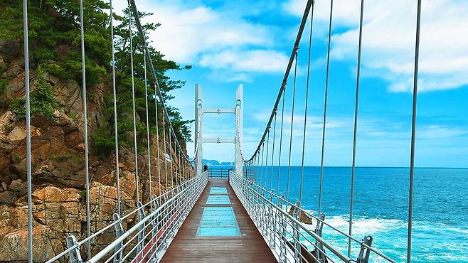 특히 다리 중앙에 설치된 투명 유리 바닥 구간은 발아래로 넘실대는 바다가 그대로 내려다보여, 잠시나마 ‘공중을 걷는 듯한’ 기분을 선사한다. 흔들림은 크지 않지만, 눈앞에서 펼쳐지는 동해의 푸른 물결과 바위는 방문객에게 잊지 못할 인상을 남긴다.
